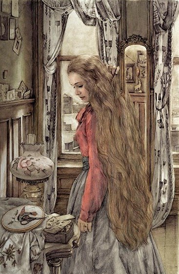 – Безсмислено е да ги търсиш – отвърна Дела. – Казах ти вече: отрязах ги и ги продадох – толкоз. Сега е Бъдни вечер, момчето ми. Бъди мил с мен, защото заради теб направих това. Може би космите в косите ми могат да се изброят – продължи тя с нежния си глас, който изведнъж зазвуча сериозно, – но кой може да измери любовта ми към теб? Да слагам ли котлетите, Джим?