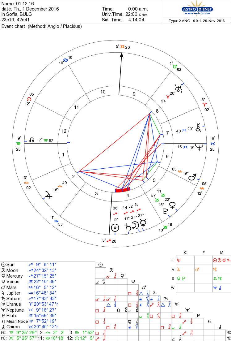 В синтезиран вид, изброявам само по-важните и точни, мажорни аспекти и конфигурации.