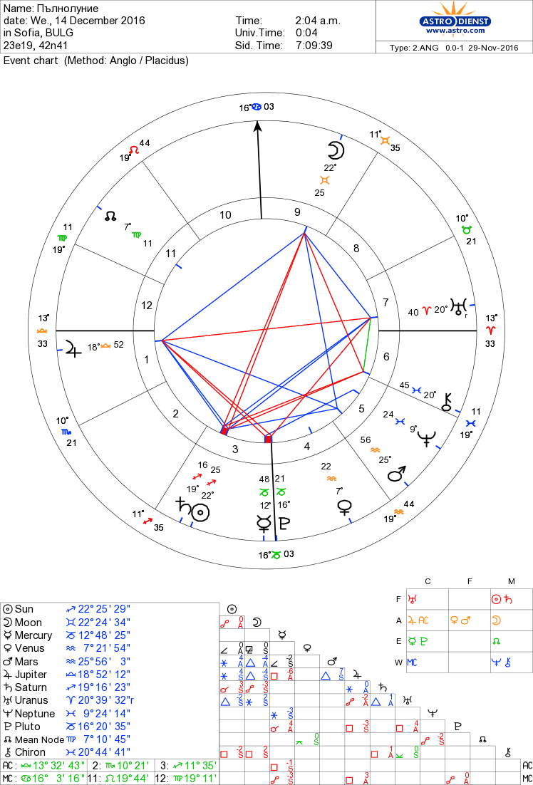 14.12. Пълнолуние в 22-я гр на Близнаци в 2.05ч, с акцент комуникация, партньорства, което сформира конфигурация каруца /кола/. Особено важна е ролята на Луната, защото тя е тази която застава на единия връх и затваря фигурата, а както знаете, нейното движение е доста бързо, което предполага и бързия й разпад. Важно за хора, чиято соларна година започва в този момент, както и за хора с важни точки в хороскопите. Конфигурацията е ключова, дава възможност за завършване, утвърждаване, преход на друго ниво.