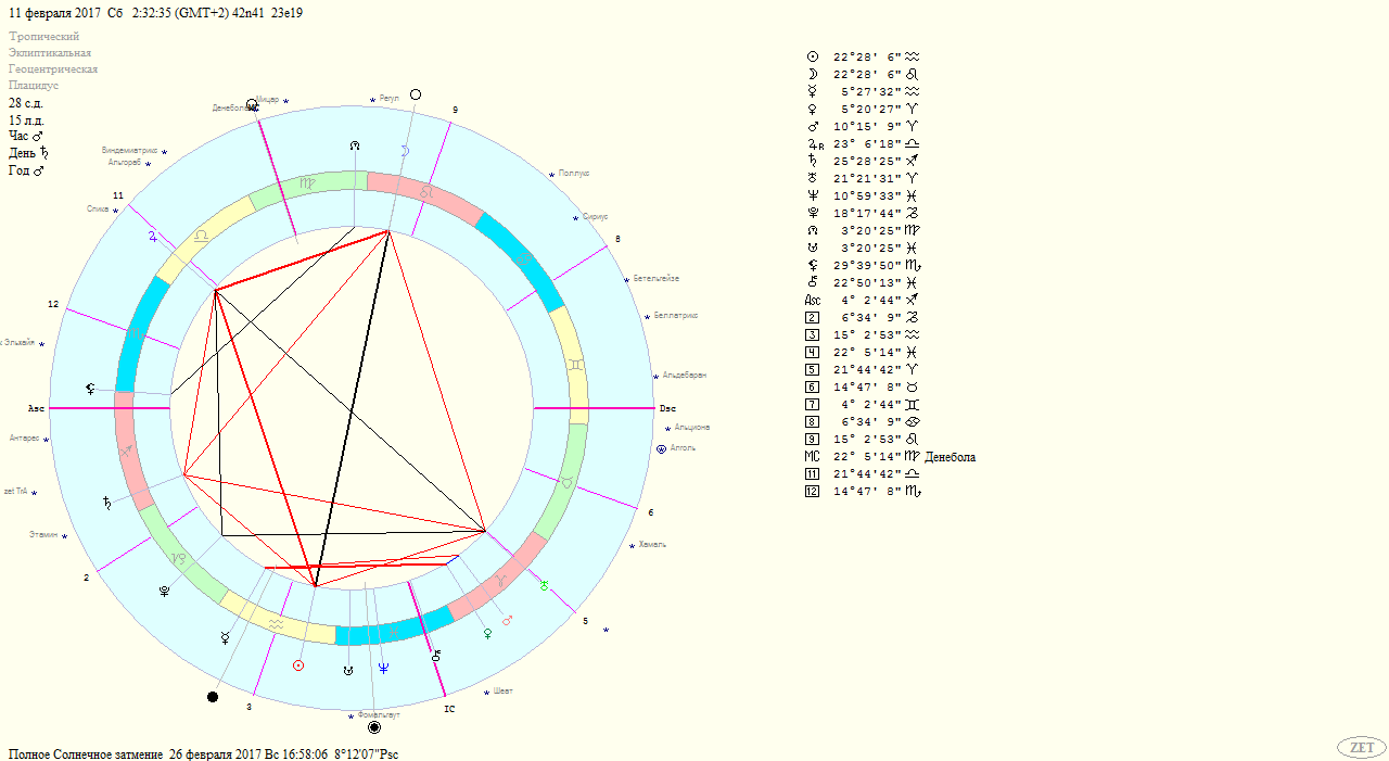 11.02. Хармонично Лунно затъмнение /полусенчесто, тъй като разстоянието до възлите е с по-голям орбис/, случващо се на 22.28гр в знака Лъв в 2.33ч. Виждате на изображението конфигурацията и аспектите които отправя към Юпитер, Сатурн, Уран. Освен това Меркурий в точен секстил с Венера. Добър момент за завършване, за изпълнение на планувани намерения, реализации.