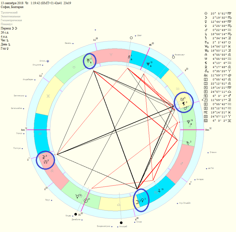 6 – 15. 09 Шести септември е доста интересен и динамичен ден, Сатурн става стационарно директен /до 11.09/. Меркурий влиза в знака Дева, което би трябвало да постави едно „заземяване“ в комуникацията, да се анализират някои отминали ситуации свързани с тази така високопарна и изтощителна негова фаза която премина през Лъв. Започва да се усеща и квадратурата между Венера и Марс която се случва в последните градуси на знаците Везни -Козирог и ще бъде най-точна на 8.09. По обясними причини и двете планети се движат по-бавно от обичайното. Това са трудни дни за отношенията между хората, между партньори, а Новолунието което е на следващия ден допълнително нагнетява. Енергията е по-слаба, размита, разпиляна. Могат да произлязат неадекватни действия, да се извадят погрешни заключения, кавги и раздори. Тази квадратура малко след точният си аспект образно се разпада или по-скоро отслабва, защото Венера сменя знака, а когато аспект се случва в два различни знака макар и точен той вече не е така силен, променя се енергията, но както се казва – „спокойно“, това ще има своето продължение, защото влизайки в Скорпион, Венера веднага се озовава срещу Уран, а малко след това, на 12.09 ги „догонва“ Марс и следва втори дубъл, не леко продължение на тази квадратура, преминаващо в голям кръст. Близкия съвпад на Марс – Лилит – Южен възел ще донесе една повторяемост от извиналите месеци. Няма да липсват провокации, трудна дни се очертават, динамични, непредсказуеми, дни на често безпрецедентни случаи /каквито впрочем вече наблюдавахме/. Срещу южния възел винаги стои северния и обратно, а в случая продължава съвпада на Селена /бялата Луна/ със Северния. Черното срещу бялото, вечната борба между доброто и злото… Когато възли и фиктивни точки са включени в такава конфигурация това не е случайно и ще бъде усетено, изпитано от много хора /но в никакъв случай от всички!/