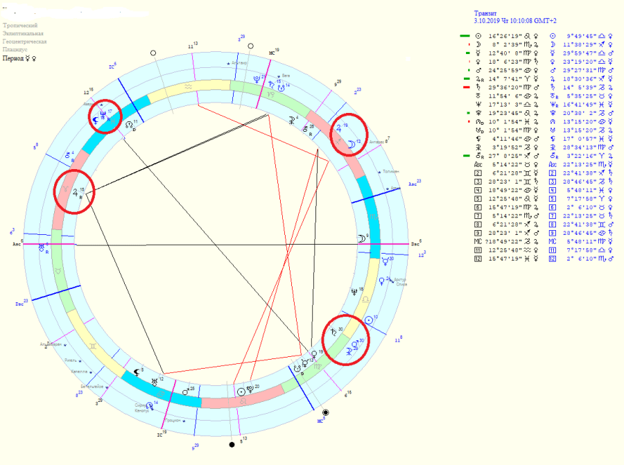 В случая 6-8-12 дом са силно активни. Вижда се силното напрежение по остта Дева-Риби, включително с намесата на Черната Луна отиваща към съвпад с Нептун. Забележете стелиума в Дева. Имаме изгорен Меркурий, изгорен Марс, невидима Венера… И трите планети управляват домове свързани със здравето. Две от планетите в този стелиум са възвратни за нея, съвпадат и с южния възел. Насреща са Черна Луна и Нептун точно на куспидата на 12 дом.