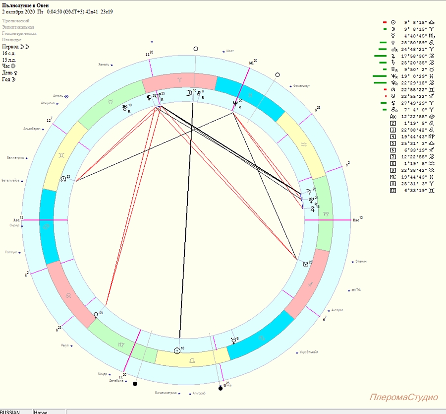 В случая имаме знака Овен и ретрограден управител Марс в собствения си знак. Тези реализации за много хора няма да бъдат някаква новост, те по-скоро ще носят отпечатък от миналото. Понякога могат да бъдат съпроводени с напрежение, в случая подчертано от „обръщането“ на Сатурн и неговата стационарно – директна фаза която съвпада с дните на това Пълнолуние. При Сатурн (всъщност важи и за останалите планети когато е дошло време за тяхната проява в живота) няма мърдане, но в случая хубавото е, че каквото и да се случва, вече ще даде и резултати, ще се активират всички сатурнови теми и хората които са благоприятно повлияни от тази планета и досега са имали редица спънки свързани с административни, юридически, имуществени въпроси (тук вече визирам и Юпитер, който започва да набира скорост), сега ще могат да си поотдъхнат. В по-негативен план, Сатурн може да отключи и някои проблеми със здравето, трудности от финансово естество, проблем с възрастни родители, роднини и отговорности свързани с тях, но всяка една проява трябва да се разглежда на изключително лично ниво!