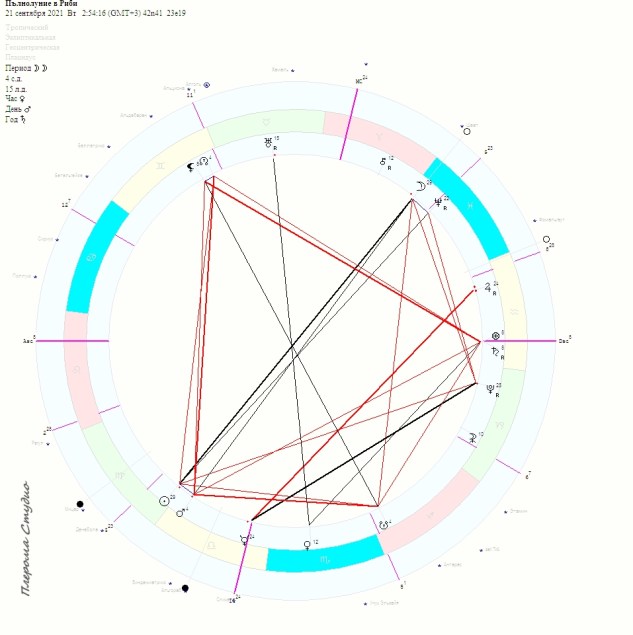 Интуитивно пълнолуние по оста на служенето и поредното в последни градуси. Приключване, край, приемане. От друга страна желание за действие, прилив на идеи чиито корен е свързан по някакъв начин с миналото – ретроградни управители, Марс в хармоничен аспект с възлите, но слаб в своята позиция. На този фон забавеното движение на Меркурий в подготовка за поредна ретроградна фаза. Това се случва в знака Везни, което в едно с Марс и преминаването на Слънцето на 22.09. в знака на равновесието ще постави акцент върху взаимоотношенията между партньори, съдружници и изобщо общуването и отношението между хората, раздвижване в съдебната система, желание за повече красота, изкуство, любов. До края на септември и дните до към 22 октомври не са подходящи за започване на нови дейности, за покупките на техника и встъпване в сериозни договорни отношения и това далеч не е само заради ретроградния Меркурий.